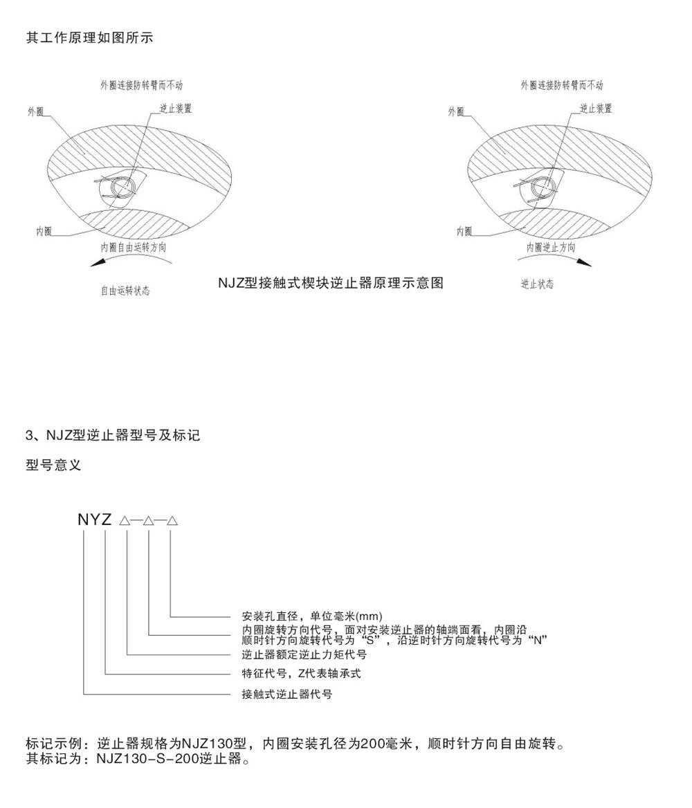 NJZ逆止器是用于各種機械中的大型低轉速防逆轉安全裝置,安裝在設備的低速軸上。內部采用均布數個楔塊組成的逆轉裝置,工作時接觸面積大,與其它同等力矩的逆止裝置具有重量輕更加安全可靠結構緊湊,逆止可靠,解脫容易,逆止力矩大,稀油潤滑好,分體結構安裝、檢修方便等優(yōu)點。其綜合機械性能明顯優(yōu)于其它逆止裝置,廣泛地應用于大傾角帶式輪送機,斗式提升機,刮板輸送機及其它有逆止要求的設備。逆止器必須正確安裝使用與潤滑維護,并保證系統(tǒng)運行平穩(wěn),運行轉速以及載荷條件在許用范圍內,逆止器不能保證所安裝系統(tǒng)動力振動而產生的故障或不良運行。